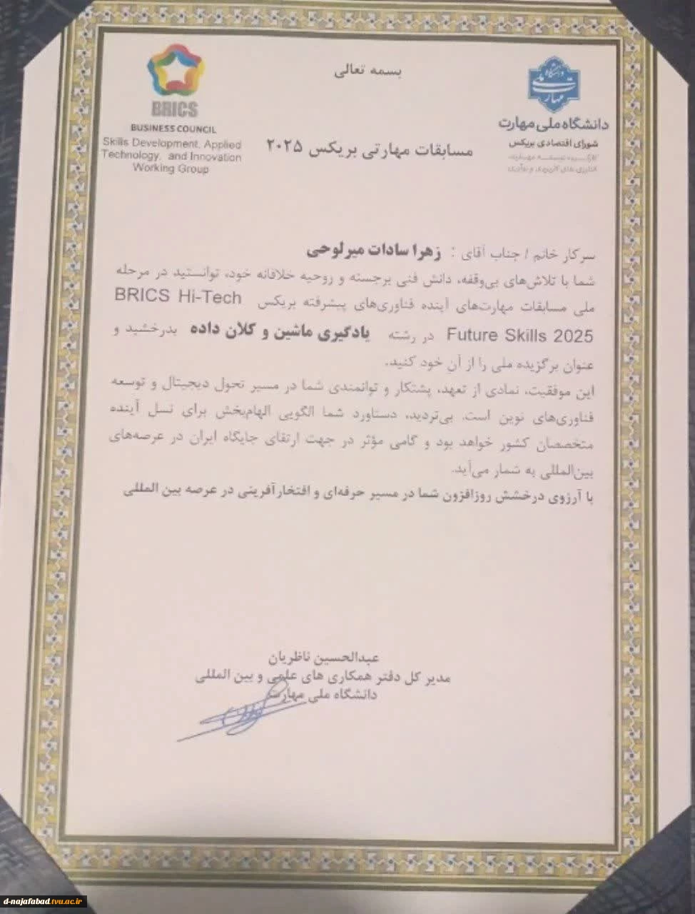 امتیاز دهید : کسب مقام دوم و رتبه برتر در مرحله ملی مسابقات مهارتهای آینده در فناوریهای پیشرفته بریکس 2025 توسط دانشجویان ملی مهارت دختران نجف آباد 4 شنبه 12 مهر 1404 ساعت 14:43